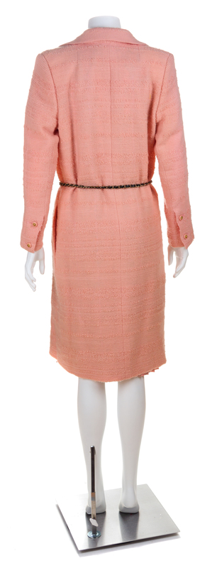 comprised of a long sleeve dress with a round neckline, decorative pleating at the bodice, a drop waist pleated skirt, a front zip and decorative logo button closure; together with a matching silk lined pink wool double breasted boucle coat with decorative pink and goldtone buttons and a black leather woven chain-link belt.Labeled: Chanel Creations.