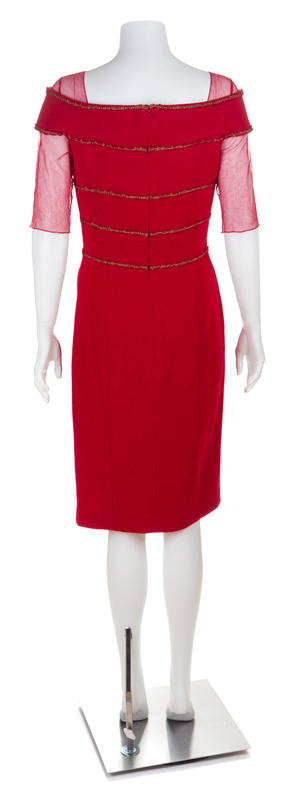 Cruise Collection 2010,with an off the shoulder neckline, red netting at the shoulders and short sleeves, bands of gold and red wool decorative trim and pleat embellishment at the left front hip and a back zip closure.Labeled: Chanel.