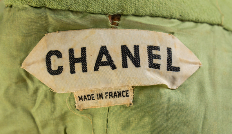 comprised of a crop jacket with a mandarin collar, green wool trim, flap waist pockets and goldtone buttons at the front closure and sleeve hem; together with a matching knee length pleated wrap skirt, hook and eye side closure and a green wool waistband.Jacket labeled: Chanel.