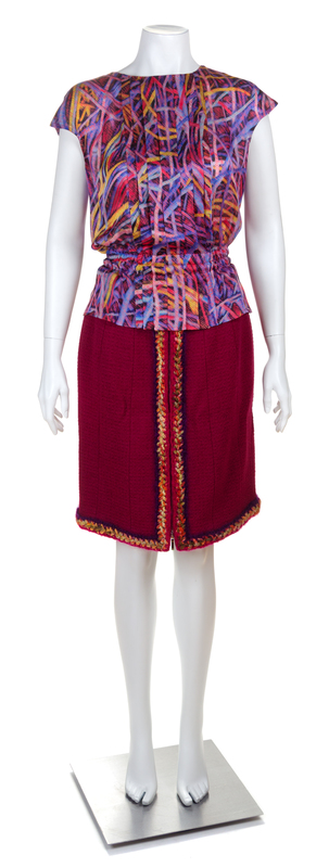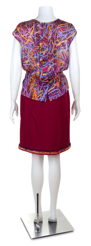 comprised of a jacket with a round neckline, multicolor knit trim, front button patch pockets and a front zip closure; together with a matching skirt with a center front zip closure and a coordinating silk blouse with cap sleeves, center front pleats, a peplum waist and back button closure.Labeled: Chanel.
