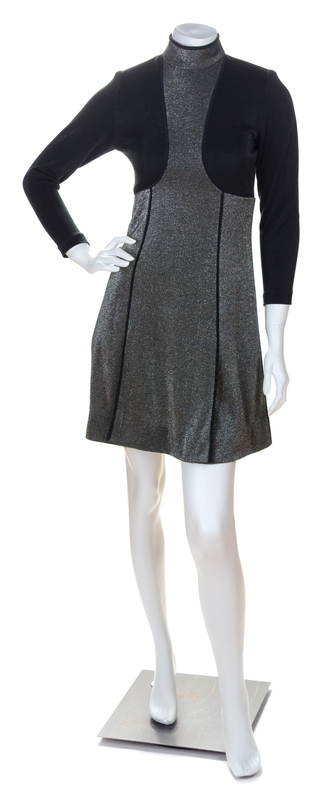 with a mock turtleneck, a silver metallic center bodice, an A-line skirt with a car wash pleat hem, zip closure at the sleeve hem and a back zip closure.Labeled: Galanos.