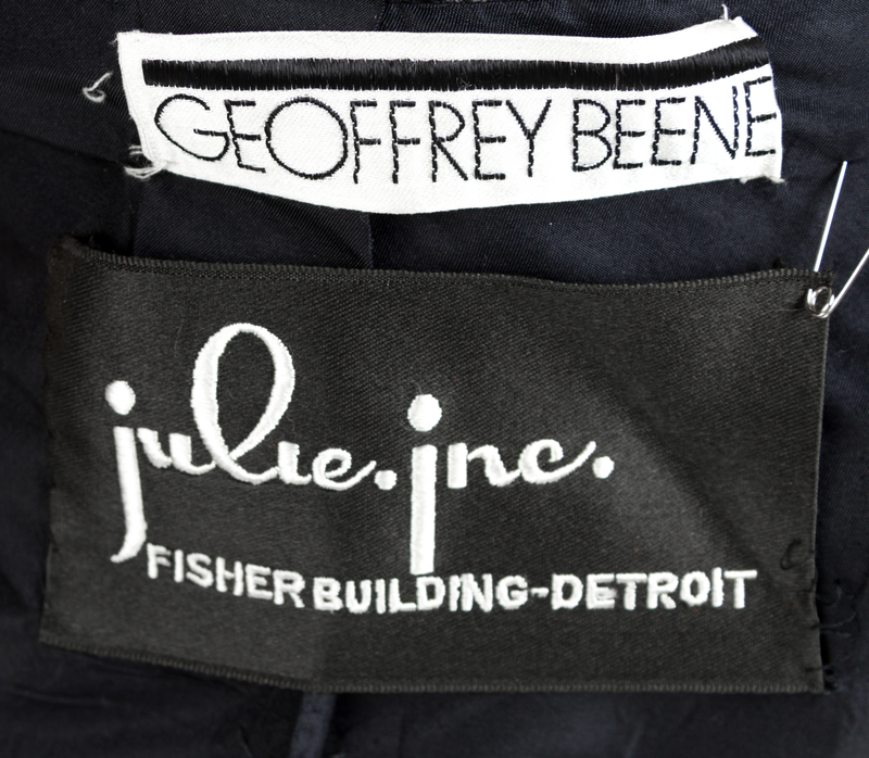 with a round and notched lapel, cream cuff sleeves and black button front closure.Labeled: Geoffrey Beene.