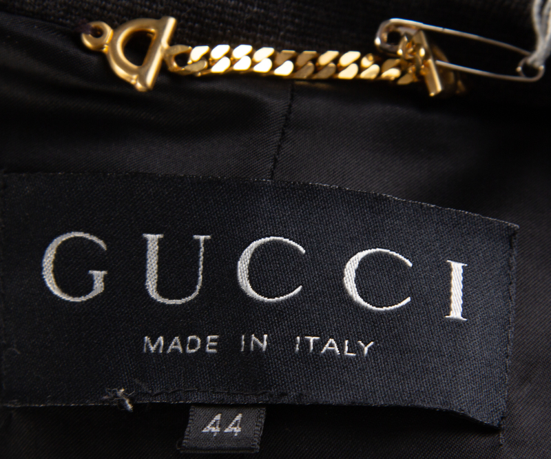 with a pointed collar, decorative goldtone logo button front closure, side button pockets, decorative belts at sleeve hem, a back yolk , a back center split hem and a removable matching belt. Labeled: Gucci.