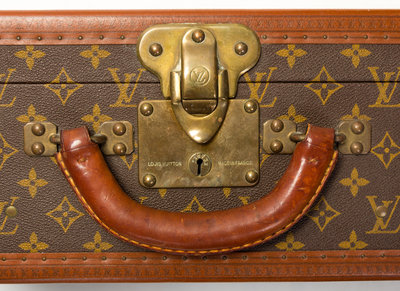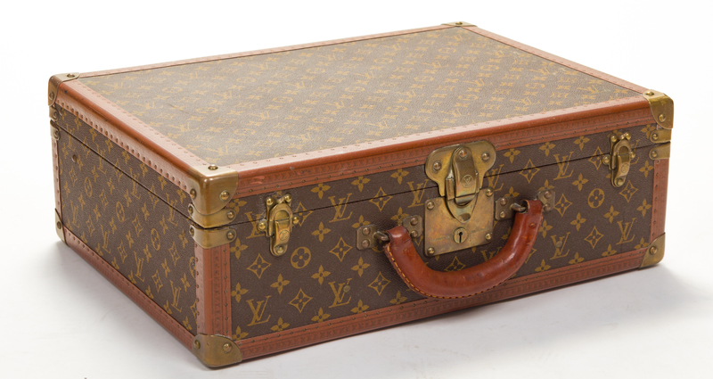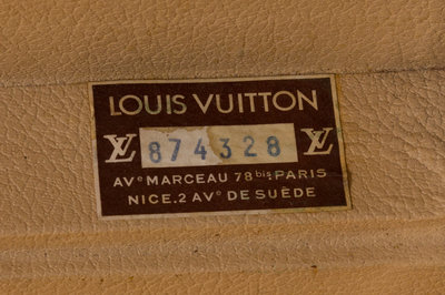 with brass hardware, brown leather trim, beige interior lining with two straps, and three top flip-lock latches with a single rolled top handle. Stamped: Louis Vuitton, (Serial #874328)