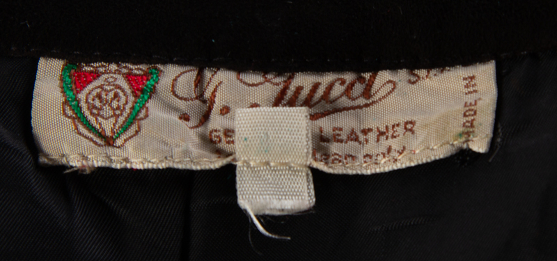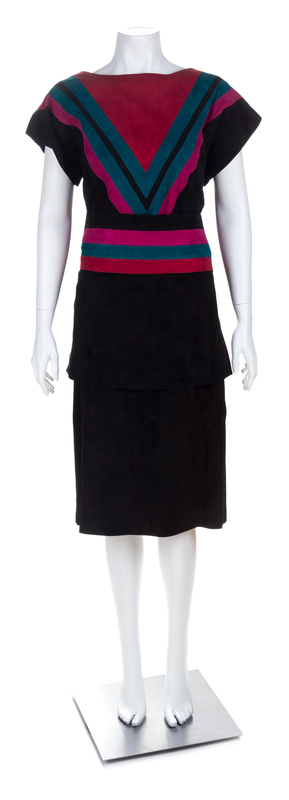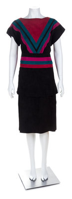 comprised of a tunic with cap sleeves, a multicolor yolk at the front bodice, a logo snap pocket at left waist and side split hems; together with a matching black suede wrap skirt with a gathered waist, front logo snap closure and a wide striped self-tie belt. Labeled: G. Gucci.