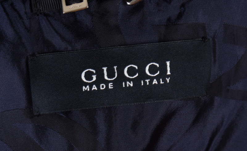 with cap sleeves, decorative navy silk trim at the back center and front hook and eye closure. Labeled: Gucci.