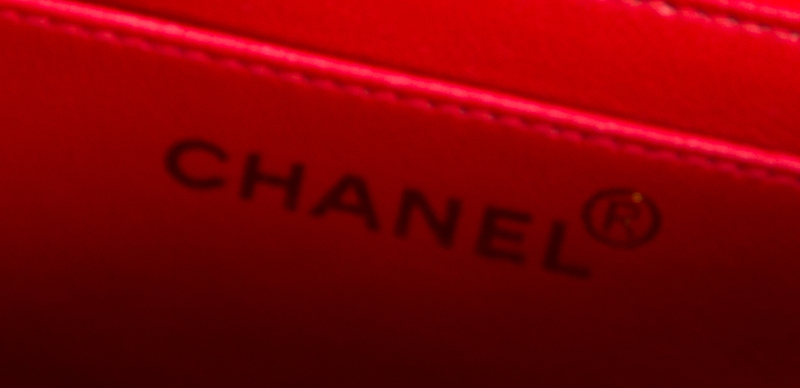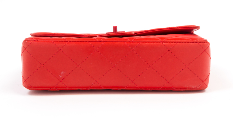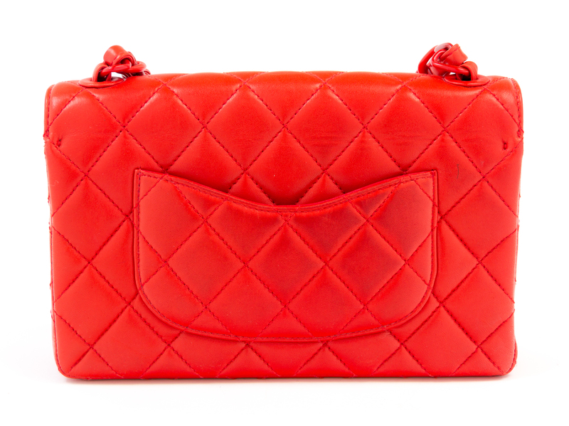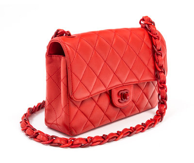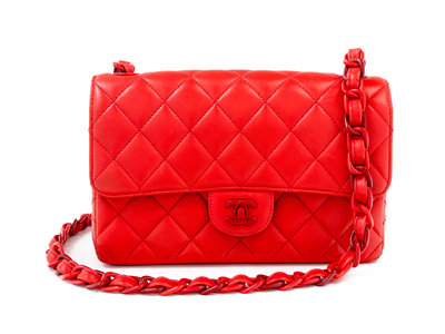 1997-1999,with a red leather woven lucite chain shoulder strap, a decorative red lucite logo turn lock closure, a back exterior crescent slip pocket and two interior pockets.Stamped: Chanel.