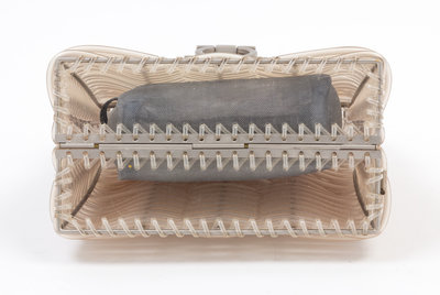 with a brushed silver metal handle, hardware and frame, a front snap closure, an interior silver mesh zipper insert and a clear acrylic bottom. Together with a dustbag and box.Stamped: Salvatore Ferragamo.