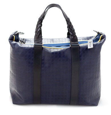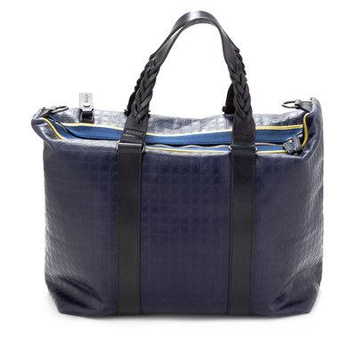 with black leather side detail, nylon interior with large zip pocket and small phone pocket, with double black leather top handles and a removable leather shoulder strap with a top navy and yellow canvas detail, and top zip closure. Together with a dust bag and box. Stamped: Salvatore Ferragamo.