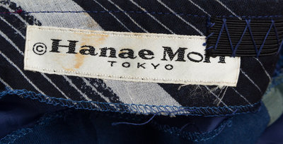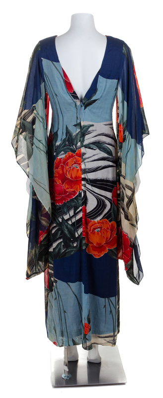 with a round neckline, billowing open sleeves, a straight silhouette, a plunging V-back and a zip closure.Labeled: Hanae Mori.