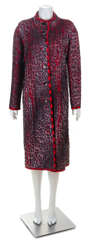 with a mandarin collar, front welt slip pockets, silk ribbon detail and partial button front closure; the reverse side red wool with black and red plaid trim and oversized side slip pockets.Labeled: Koos.
