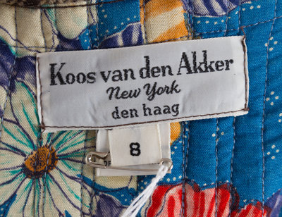 comprised of a crop jacket with a three-tie front closure and a quilted floral lining; together with a coordinating A-line skirt with a drop waist, welt side slip pockets, quilted floral detail and a back zip closure.Labeled: Koos van den Akker.