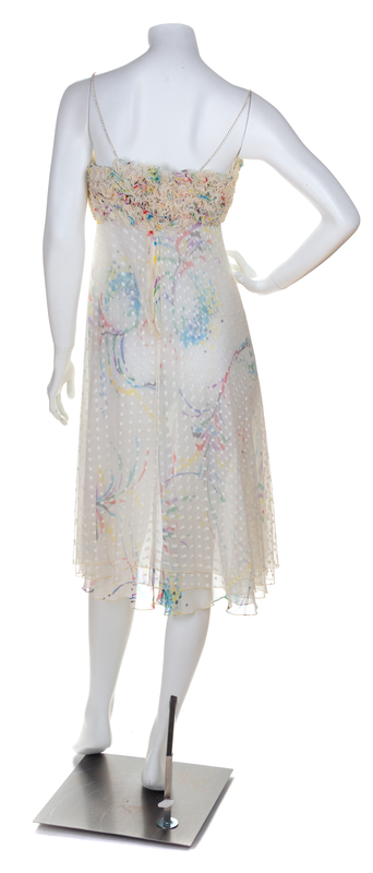 with rhinestone spaghetti straps, a ruffle bustline, a faux wrap front, two layers of a sheer polka dot overlay, a fabric bow embellishment and a back zip closureLabeled: Koos.