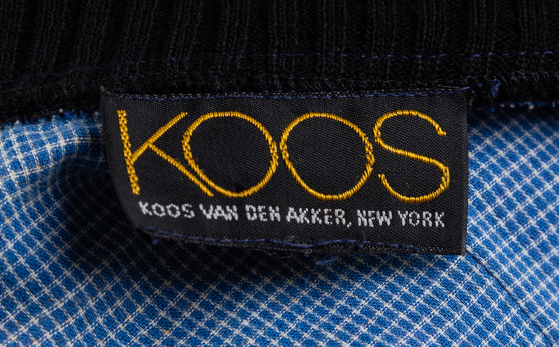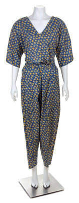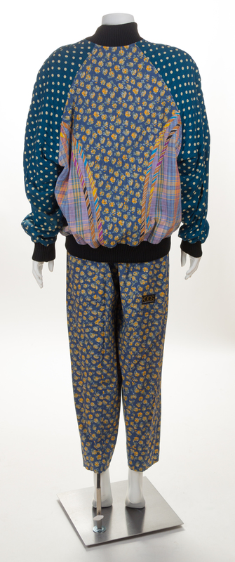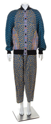 comprised of a quilted jacket with a black ribbed collar, cuff and waistband; side slip pockets and front button closure; together with a coordinating high waist patterned pant with an elastic waistband, front and back patch pockets, a front zip closure and a matching short sleeve crop blouse with a V-neckline.Jacket and pants labeled: Koos.Blouse labeled: Koos Couture.