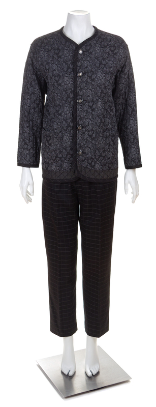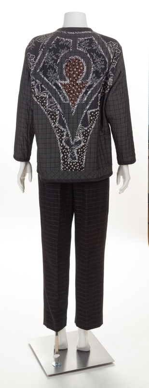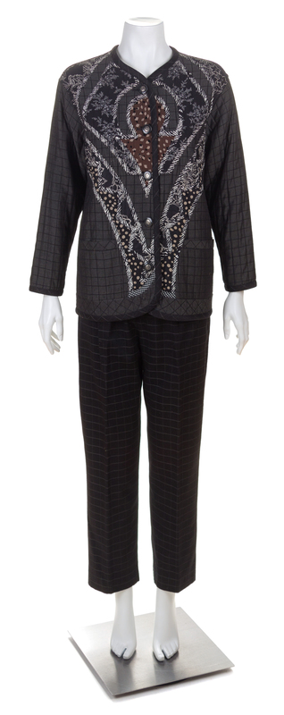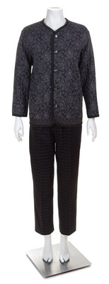comprised of a jacket with a slight V-neckline, multi fabric quilting on the front and back bodice, front slip pockets and decorative button front closure; together with a black wool pant with an elastic waistband, side slip pockets and a side zip closure.Jacket labeled: Koos.