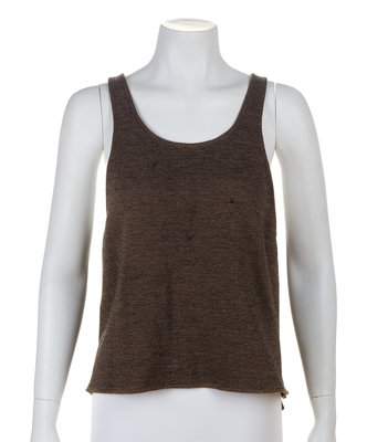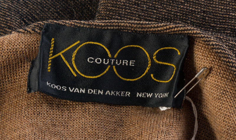 with a round neckline, patterned wool trim, side slip pockets and button front closure; together with a matching brown crop sleeveless shell.Each labeled: Koos Couture.