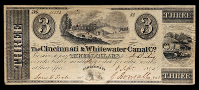 Obsolete $3 Bank Note: The Cincinnati & Whitewater Canal Co.