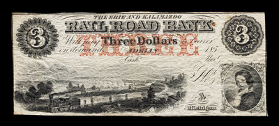 Obsolete $3 Bank Note: The Erie and Kalamazoo Rail Road Bank
