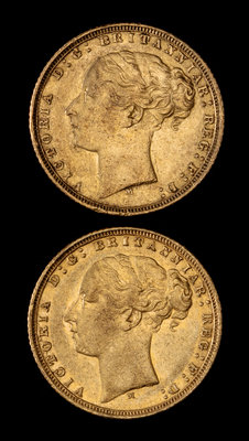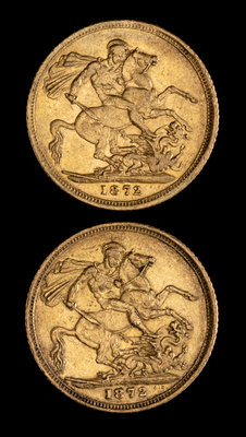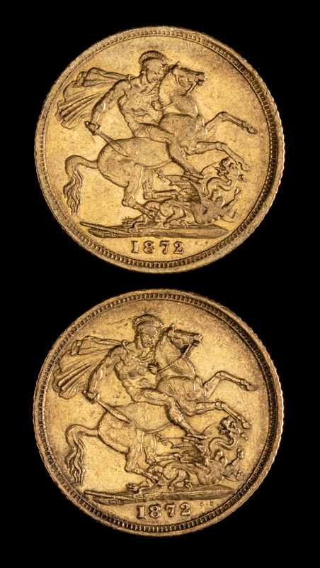 Two United Kingdom 1872-M Sovereign: Young Victoria-Melbourne Mint Gold Coin