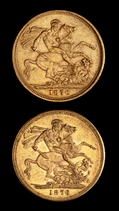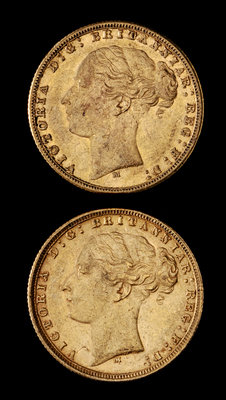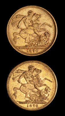 Two United Kingdom 1876-M Sovereign: Young Victoria-Melbourne Mint Gold Coin