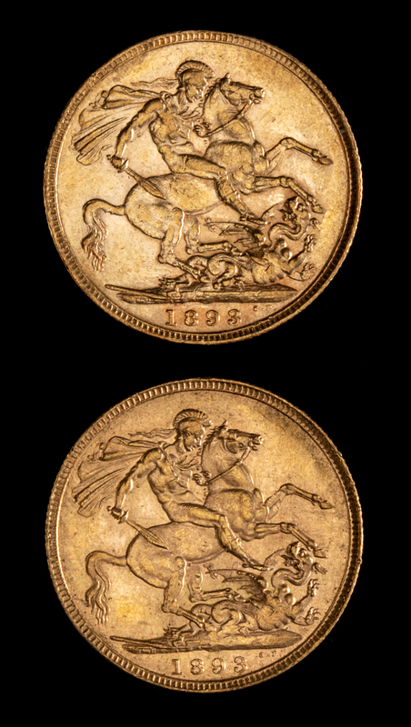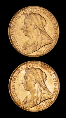 Two United Kingdom 1893 Sovereign: Veiled Head-London Mint Gold Coin
