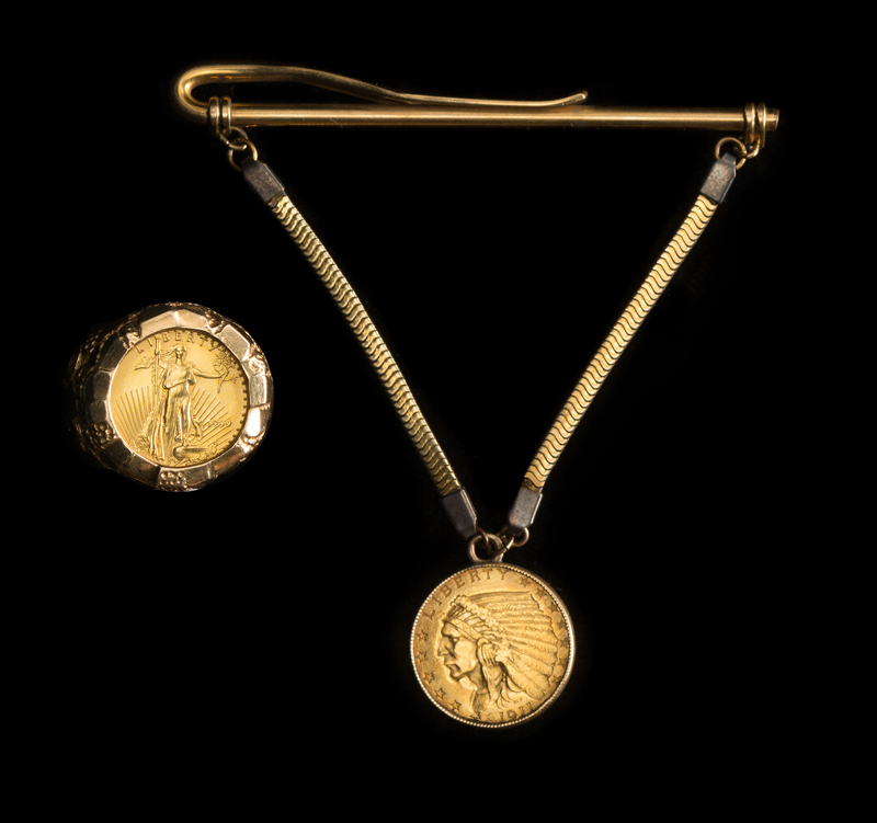comprising a 1911 Indian Head $2.50 Gold Coin mounted to a tie-bar and a 1999 Gold Eagle $5 coin mounted to a ring.