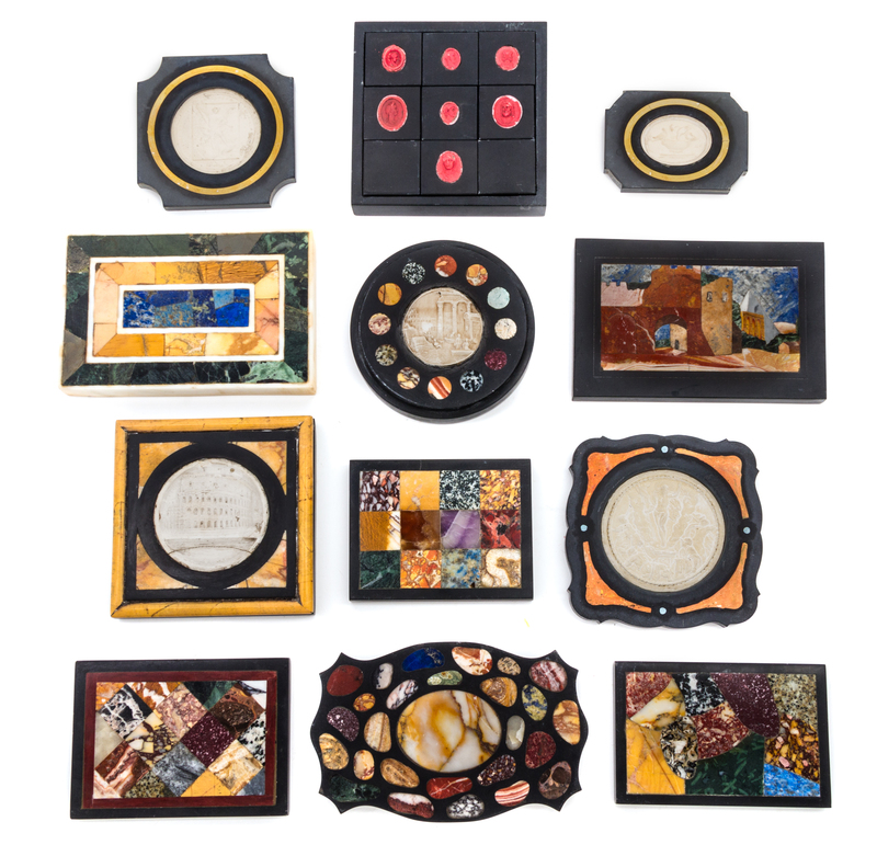 consisting of twelve paperweights inlaid with various hardstones and intaglios depicting several typical Italian scenes or displaying colorful patterns comprised of various colored hardstones.