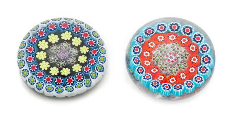 two concentric millefiori paperweights