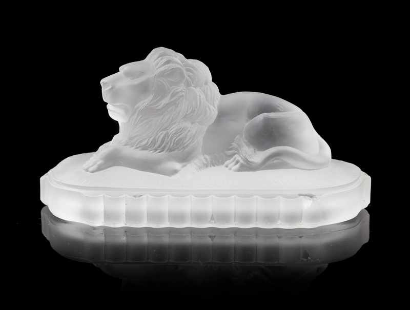 an antique centennial exhibition molded frosted glass lion paperweight