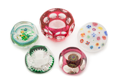 comprising three by Baccarat including one red cut to clear, a caned latticino and a faceted sulfide John F. Kennedy example, and two others, each with internal caning, one with flowers, the other dated 1856.