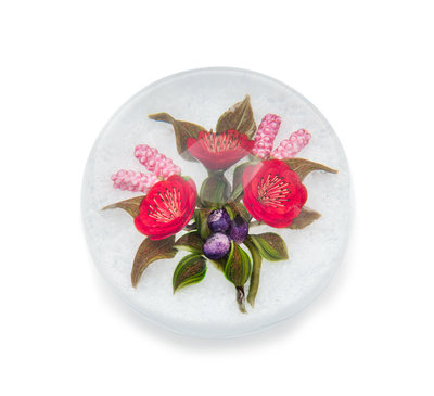 a large paperweight, interior including flowers and fruit on a snowy ground, 2000