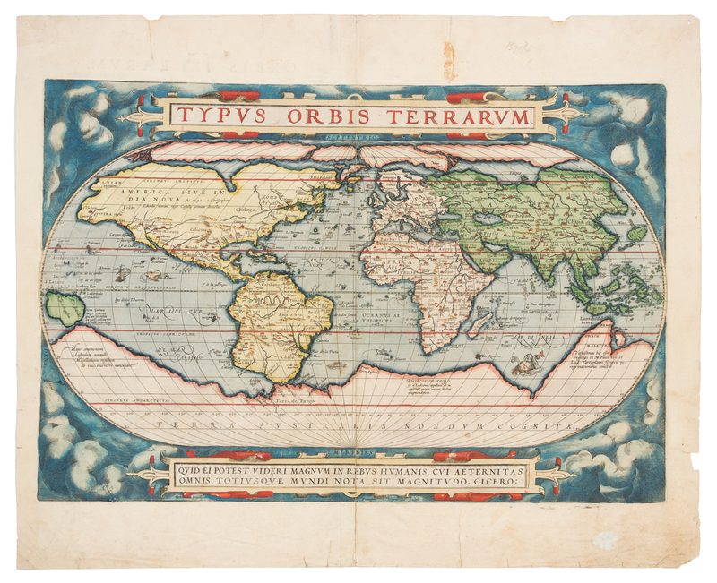 Engraved world map, image 338 x 496 mm (sheet 450 x 540 mm), with contemporary hand-coloring. Title within a strapwork banner, quotation from Cicero lower margin, Latin text on verso (Van den Broecke 1584L1). (Some light marginal chipping with occasional minor losses, a few marginal tears repaired on verso, approximately 7-in. split to fold repaired on verso.)Ortelius's one-sheet reproduction on an oval projection of Mercator's 21-sheet world map of 1569. One of the most influential and frequently copied maps of the 16th century, this edition was engraved by Frans Hogenberg, whose name (but no year) appears lower right. This is the first (of three) world maps included in Ortelius' Theatrum orbis terrarum. Shirley 122; Van den Broecke 1.3 (with crack and bolt impressions visible lower left).