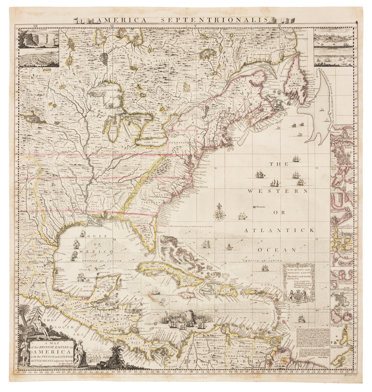 Engraved map of America, hand-colored in outline, image 509 x 485 mm (sheet 531 x 500 mm). Decorative cartouche depicting Native Americans and European settlers, insets of Niagara Falls, Mexico, Quebec, and New York, small insets of 18 important harbors including Boston, New York, Charleston, and Porto Bello. (Small paper flaw upper margin, some light spotting, margins lightly toned.) FIRST EDITION, BABINSKI'S FIRST STATE of Popple's key map: without imprint below border at lower left, imprint bottom right "W.H. Toms Sculp.", with the course of the Spanish galleons not present, Cape May and Cape Hinlopen not named off Delaware Bay. This copy is like "most, if not all, colored copies [which] do not have the 4 corner views or the title cartouche at bottom left colored" (Babinski). The key map accompanied Popple's first large-scale map of North America printed on 20 sheets (see previous lot). Babinski, Henry Popple's 1733 Map of the British Empire in America Key Map; Cummins 217.