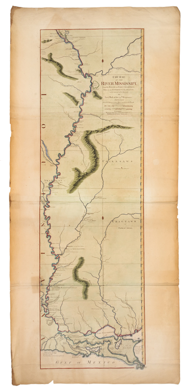 Engraved map of the Mississippi River, on two sheets joined, hand-colored in outline and wash, image 1112 x 344 mm (sheet 1228 x 560 mm). (A few short tears, some with repairs, some browning and staining heavier at margins.) FIRST EDITION, FIRST ISSUE, of the first map of the Mississippi based on English sources. Lieutenant John Ross's map shows settlements, forts and villages along the central and lower course of the Mississippi. SCARCE FIRST ISSUE: according to online auction records, no copies have sold at auction in the last 40 years. Stevens & Tree 31a.
