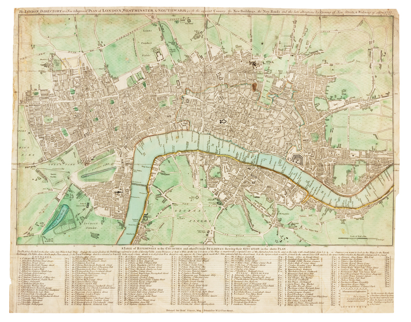 SAYER, Robert (1725-1794). The London Directory or a New & Improved Plan of London, Westminster & Southwark; with the adjacent Country, the New Buildings, the New Roads and the late alterations by Opening of New Streets, & Widening of others 1777. [London], 1777.