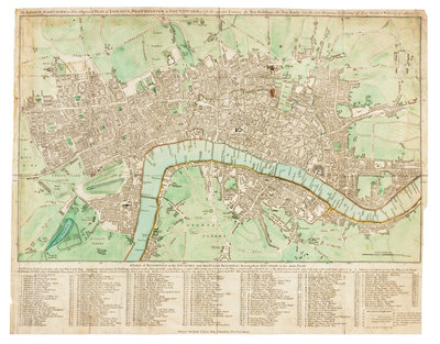 Engraved hand-colored map of London, image 403 x 500 mm (sheet 406 x 515 mm). (A few splits along folds, many reinforced on verso, 1 -in tear in Hyde Park.) Sayer's pocket map was issued numerous times between 1765 and 1800, and depicts the major roads and parks in London, as well as the Westminster, Blackfriars, and London Bridges crossing the Thames and an extensive key in the lower margin.