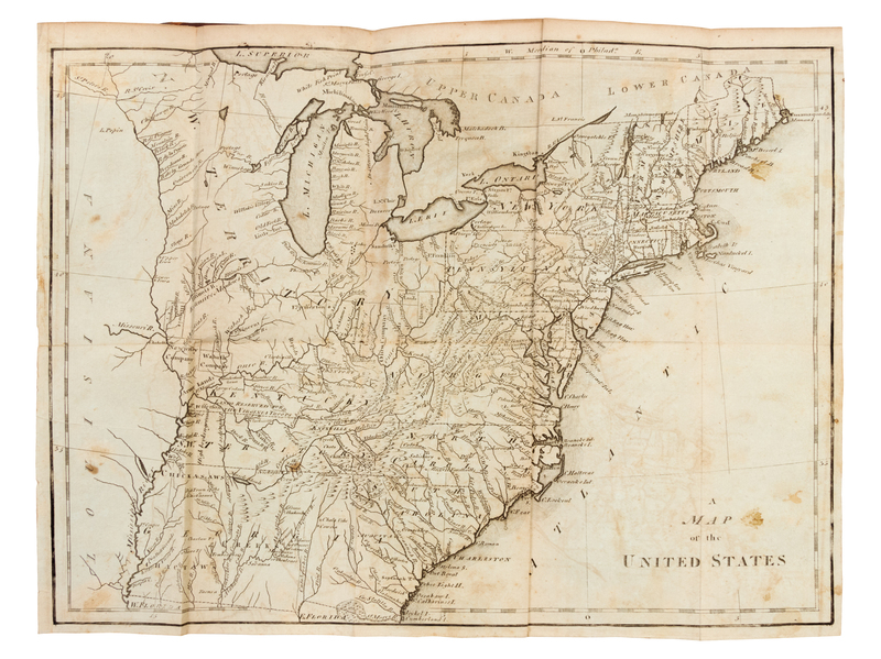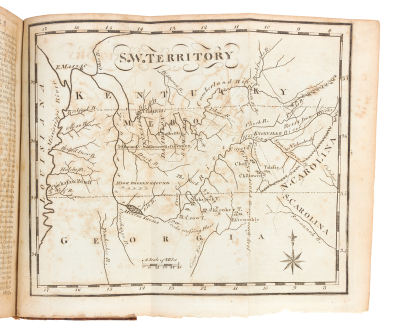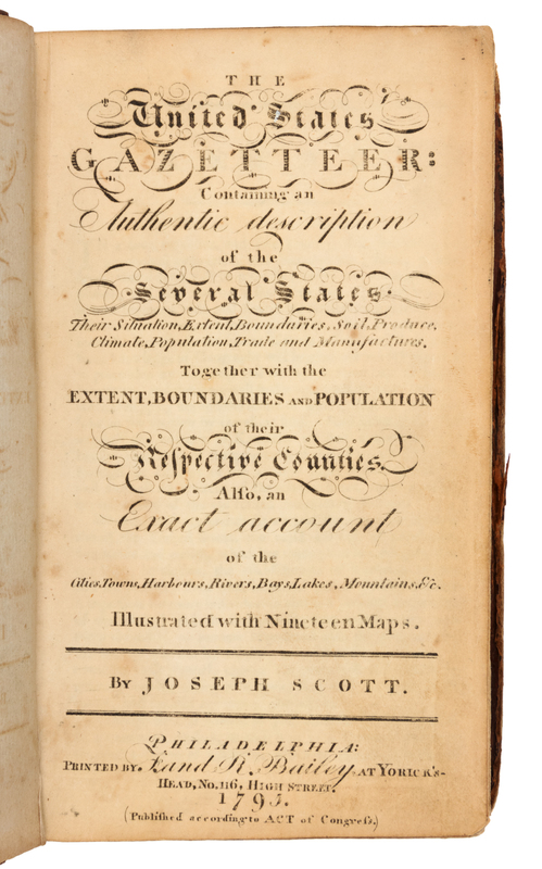12mo (168 x 101 mm). Engraved title-page, 19 engraved folding maps. (Map of United States with a few short splits to folds, map of Maine edges slightly fraying and soiled and with 3 1/2-in tear with old repair on verso, some light browning or spotting as usual.) Contemporary mottled calf, red morocco lettering-piece gilt, smooth spine gilt (joints splitting, vertical split to spine, spine ends chipping, some overall light wear). FIRST EDITION OF THE FIRST GAZETTEER OF THE UNITED STATES. Scott drew and engraved the maps, which depict the United States, Connecticut, Delaware, Georgia, New Jersey, Kentucky, Maine, Maryland, Massachusetts, New Hampshire, New York, North Carolina, Pennsylvania, Rhode Island, South Carolina, the Northwest and Southwest Territories, Vermont, and Virginia. Evans 29476; Howes S-237; Sabin 78331.