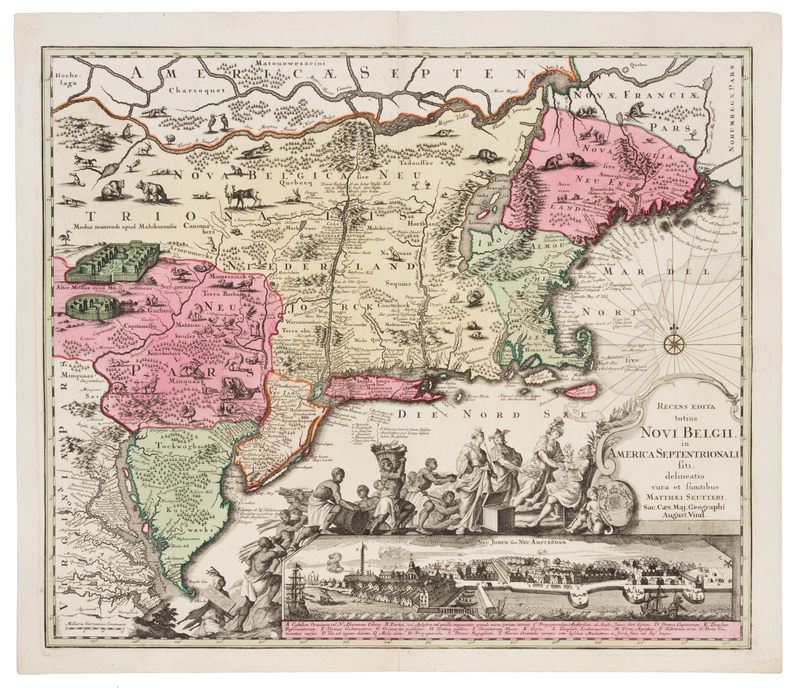 Engraved map with hand-coloring in outline and wash, 499 x 581 mm image (sheet 548 x 628 mm). Figural cartouche paying tribute to an English monarch (likely George II), animals, and a Native American fort. (Short closed tear right margin affecting border, 1-in. tear to lower fold just crossing cartouche, a few short marginal tears.) FIRST EDITION, second state with "Sac. Caes. Maj Geographi August. Vind" at the end of the imprint. Seutter's map replaces the Restitutio cartouche (found in maps in the Jansson-Visscher series, see lots 32, 33, and 57) with a new one depicting gods and natives. The view is entitled "Neu Jorck sive Neu Amsterdam," and the key is in Latin, not Dutch. Seutter's is the first map in the series to use printed lines to delineate the boundaries of Massachusetts, New England, New York, New Jersey, and Pennsylvania. See Phillips 583; Tooley America, p.291 (second state).