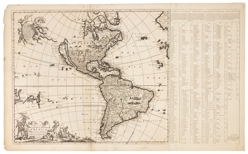 Engraved map of the Americas, image 490 x 582 mm (sheet 538 x 878 mm). Decorative cartouche with Native Americans, serpents and cherubs, decorative cartouche depicting two angels, a Native American and a devil falling away, letterpress Alphabetical Table of Names tipped to right margin with descriptions in Latin, Dutch, French and English. (Short splits at ends of fold, a few short most marginal tears repaired on verso.) FIRST EDITION, the third state, first engraved in 1670, and updated to include New Guinea, the Solomon Islands, Quiri Regio, Fretum Aniani and Terra Esonis. McLaughlin 49 (state 3); Tooley America 33.