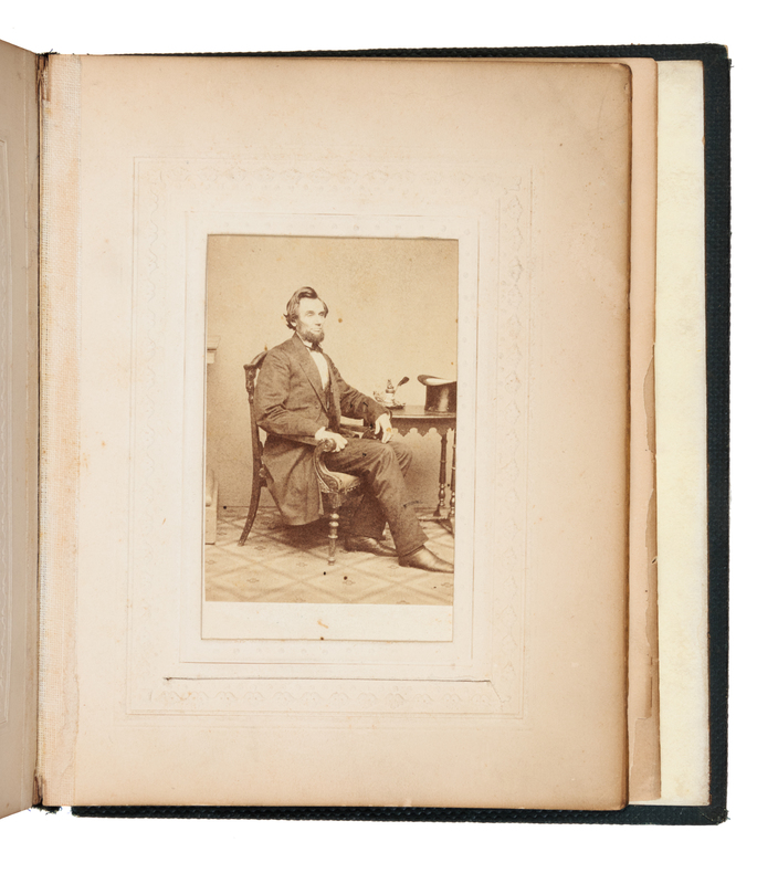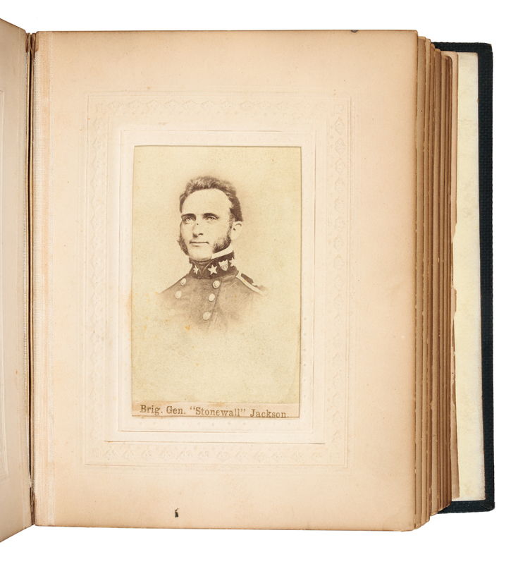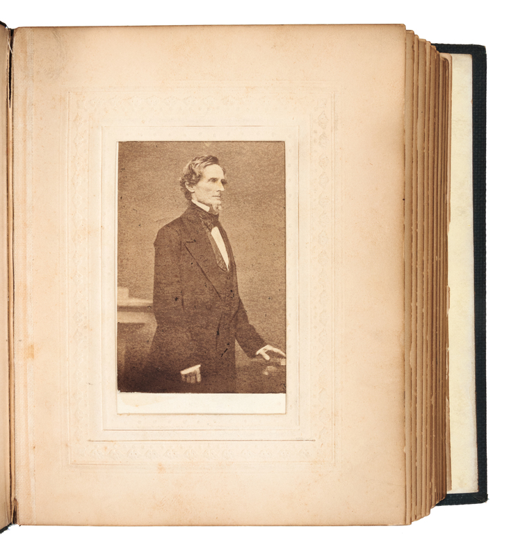 [LINCOLN, Abraham (1809-1865)]. Civil War-era album containing 22 carte-de-visite portraits of Lincoln, Confederate officers and politicians window-mounted, many from photographic negatives of Matthew Brady's National Portrait Gallery. Various imprints including: Baltimore: Jas. S. Waters, Bendann Brothers; New York: E. Anthony, E. & H. Anthony, ca 1862-1864. (A few portraits with small chips or tears affecting backgrounds, a few pale stains, a few short tears to mounts.) Green gilt-stamped cloth, edges gilt (lower cover and endpapers detached, upper hinge starting).