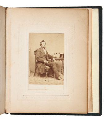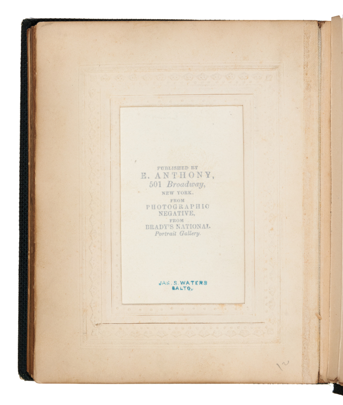 Album includes a portrait of Lincoln seated at a table with his top hat, published in New York by E. Anthony from a photographic negative from Brady's National Portrait Gallery, and additionally stamped by Jas. S. Waters, Baltimore. Other subjects include Jefferson Davis, Alex H. Stephens, Joseph E. Johnston, Henry A. Wise, Stonewall Jackson, P.G.T. Beauregard, John B. Magruder, Benjamin McCulloch, Clement Vallandingham, and Franklin Buchanan. Also included are several Maryland political figures, including Chief Justice Roger B. Taney, Severn Teackle Wallis, Raphael Semmes, and George Proctor Kane. Imprints vary slightly, with many additionally stamped Jas. S. Waters Baltimore. Complete list of subjects and imprints available on request.
