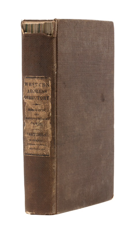 12mo (176 x 115 mm). 90 leaves of advertisements throughout printed on green, yellow, tan and pink paper. (Some light spotting, inkstain to title-page and the first few leaves.) Original brown cloth, printed label on spine (1/2-in. portion of head of spine lacking, some chipping to printed label and foot of spine, some light wear). FIRST EDITION, including information about merchants and businesses in Pittsburgh, Dayton, Wheeling (VA), Cincinnati, Zanesville, Madison (IN), Portsmouth (OH), Louisville, and St. Louis. The Directory was intended to serve as a guide to travellers throughout the Mississippi Valley, and also includes a list of steamboats operating in western waters. RARE: online auction records trace only three copies at auction in the last 50 years. Howes L-576; Sabin 12767.
