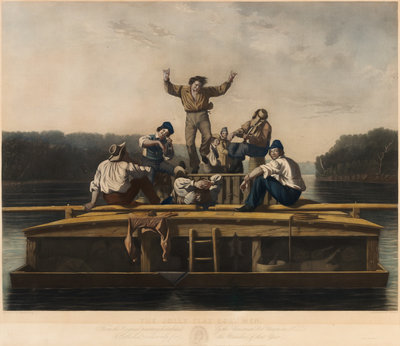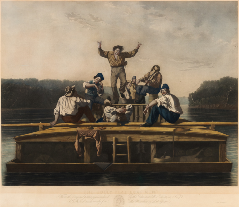 Jolly Flat Boat Men. Mezzotint with hand-coloring, New York, 1847, image 538 x 608 mm (sheet 578 x 680 mm), on wove paper, with margins, laid down on backing board, marginal mat burn, 4 1/2-in. tear crossing image repaired, short marginal tear left margin, minor surface abrasions lower margin, matted and framed. George Caleb Bingham's "first genre painting to receive much attention was 'Jolly Flatboatmen'...He has preserved with realism and humor, certain characteristics in old-time Missouri life" (DNB).