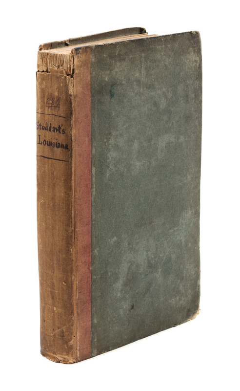 8vo (230 x 140 mm). (Slight browning or spotting as usual.) ORIGNAL CLOTH-BACKED BOARDS, manuscript title and shelfmark lettered on spine (some light wear, small loss to head of spine). FIRST EDITION. Major Stoddard was the first civil and military commandant of Upper Louisiana, and his work contains "some of the earliest detailed geographical information to be published on Upper Louisiana" (Wagner-Camp). He describes the extant boundaries of Louisiana (at the time, the western boundary had not yet been estabilshed), as well as the rivers of the region, including the Arkansas River, the Red River, and Rio Bravo; he also includes information about the fur trade, lead mines, and "Salt Mountain." Graff 3994; Howes S-1021; Sabin 91928; Wagner-Camp 10C.