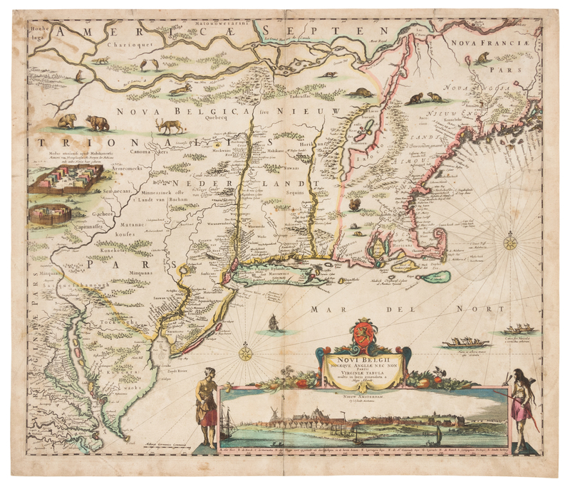 Engraved map with hand-coloring in outline, image 464 x 542 mm (sheet 495 x 574 mm). Figural cartouche incorporating view of "Nieuw Amsterdam Op 't Eylant Manhattan," galleons, canoes, animals, and a Native American fort. (Laid down on old sheet of paper, a few short tears to folds and margins occasionally crossing image with old repairs on verso, lightly browned.)FIRST EDITION, FIRST STATE of "this uncommon map [which] closely follows the Visscher of c.1655, itself based upon the Janssonius of 1651" (Burden). The first state is the only one to bear the Visscher view of New Amsterdam, which is replaced by the Restitutio view in subsequent states. SCARCE: according to online records, only two copies of this map have appeared on the market at auction in the last 50 years. Burden traces only 4 copies in institutions. Burden 373 (state 1); Tooley America, p.287 (first state).