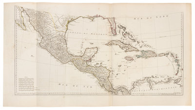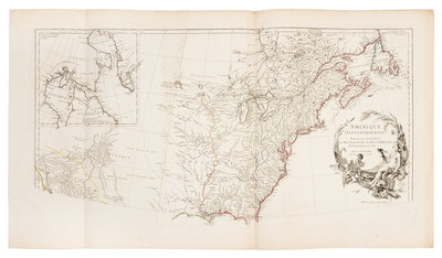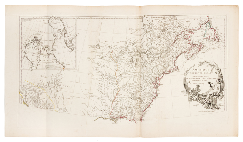 Engraved map of North America, hand-colored in outline, on 4 sheets joined as 2, overall image 900 x 1730 mm (overall sheet 916 x 1946 mm). Inset of Hudson and Baffin Bays, decorative cartouche depicting cherubs and a Native American. (Small paper flaw in Lake Michigan, some light spotting or offsetting.) D'Anville "dominated not only French but all contemporary geographersHis representation of the Great Lakes is superior to that of his contemporary, John Mitchell" (Tooley, America p. 316-7).