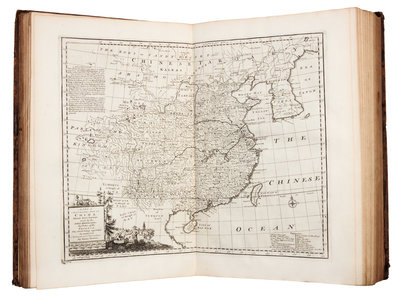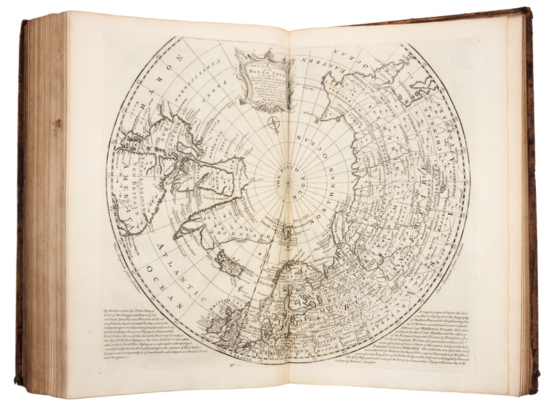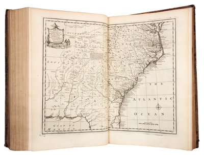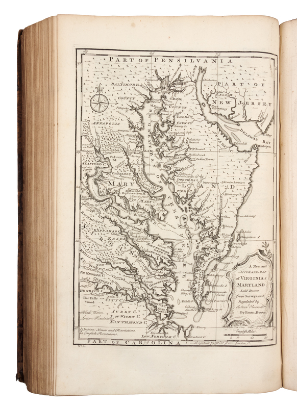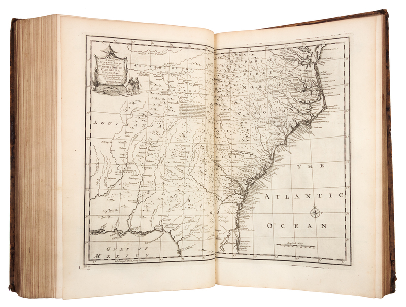 2 volumes, folio (416 x 260). General title and titles to each volume printed in red and black, 2 engraved plates, 69 engraved maps (46 double-page, one double-page folding). (Some pale mostly marginal spotting, first volume with pale marginal dampstain to a few leaves and a few small wormholes upper margin on approximately 20 leaves.) Contemporary calf (losses to spine ends, some overall wear). FIRST EDITION of the System of Geography by "one of the leading 18th-century map and printsellers and engravers in London" (Tooley), based on the fourth edition of the Compleat Geographer published by Herman Moll. With 22 maps relating to the Americas. The maps were also published in A Complete Atlas of 1752, and John Harris's Complete Collection of Voyages of 1744-1748. ESTC T140529; Phillips 603 (calling for 68 maps and 2 plates only).