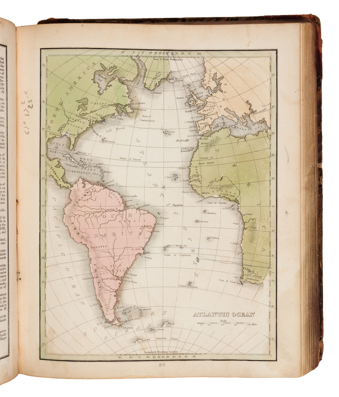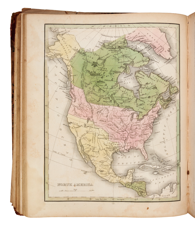 4to (290 x 240 mm). Hand-colored engraved frontispiece, engraved title, 78 engraved maps and diagrams, most hand-colored in outline. (Dampstaining, a few maps with marginal tears, last map with small surface adhesion.) Contemporary half calf, marbled boards (covers detached, endpaper and frontispiece disbound, spine lacking, overall wear and rubbing). Later edition, THE FIRST ATLAS TO INCLUDE A SEPARATE MAP OF TEXAS, including one page of descriptive text about the map of Texas. Bradford's atlas was issued at least four times in variant issues. The first was issued by Ticknor in Boston and others in 1835, and includes no separate map of Texas (see previous lot). Later that same year, Bradford issued the atlas again, published by the American Stationer's Company. Interested in the revolutionary events taking place in Texas at the time, Bradford inserted a new map of Texas. The map of Texas in this atlas appears in its earliest form, with "Mustang or Wild Horse Desert" shown in south Texas, "Nueces River" designated as the southwestern boundary of Texas, land grants shown instead of land districts and counties, and the city of Austin (founded 1839) not yet mentioned. The printed index calls for "Map of Texas 64A. 64B. 64C." See Phillips 770; see Sabin 7260; see Wheat Transmississippi 408-410.