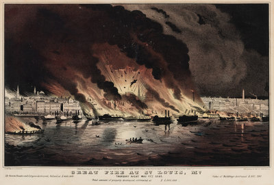 The Great Fire at St. Louis, Mo, Thursday Night May 17, 1849. Lithograph with hand-coloring heightened in gum arabic, 1849, image 224 x 324 mm (sheet 275 x 384), on wove paper, with margins, pale mat burn, minor surface abrasions upper margin just touching upper border, old backing, matted and framed. RARE: according to online auction records, only 3 copies of this print have sold at auction since 1924.
