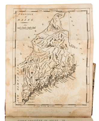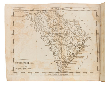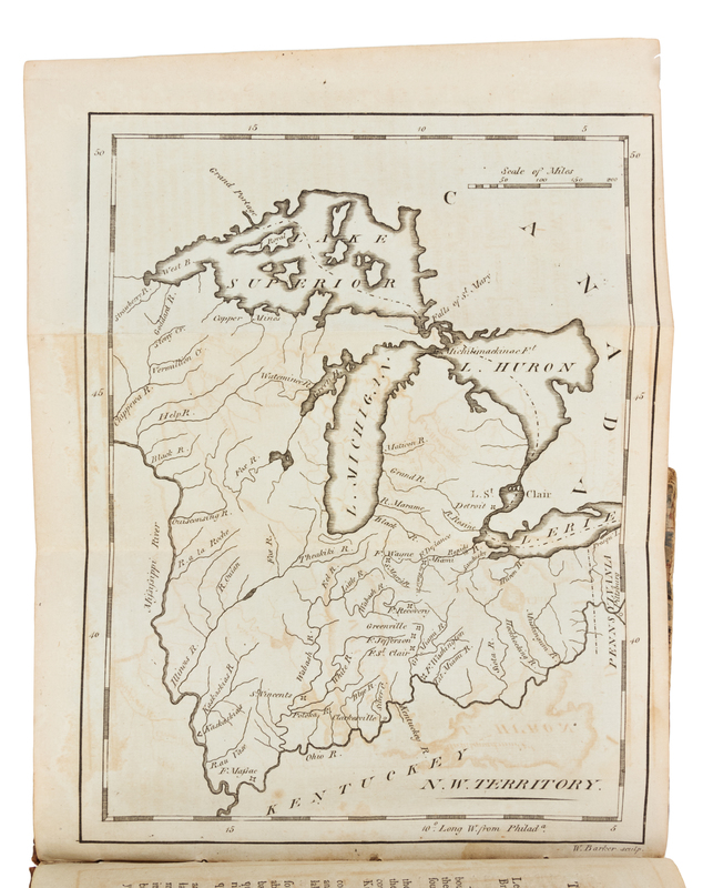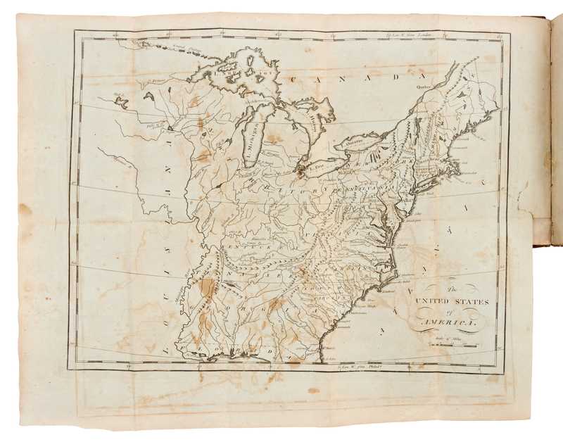 12mo (168 x 100 mm). 19 engraved folding maps. (Map of the United States with short tear repaired and a few minor splits at folds, a few other minor splits to a few other maps, some browning or offsetting.) Contemporary calf-backed marbled boards, smooth spine gilt (joints starting, chipping to head and foot of spine with some losses, some creasing to spine, rubbed). FIRST EDITION OF THE FIRST AMERICAN POCKET ATLAS, with maps engraved by William Barker, Joseph H. Seymour, and Amos Doolittle, including a general map of the United States, as well as maps of Vermont, New Hampshire, Maine, Massachusetts, Rhode Island, Connecticut, New York, New Jersey, Pennsylvania, Delaware, the Northwest Territory, Maryland, Virginia, Kentucky, North Carolina, Tennessee, South Carolina and Georgia. Carey reissued the work in 1801, 1805, and 1814. COMPLETE COPIES OF THIS WORK ARE RARE AT AUCTION: according to online records, only 4 complete copies have appeared on the market in the last 40 years. Evans 30161; Howes C-137; Phillips 1364; Sabin 10856.